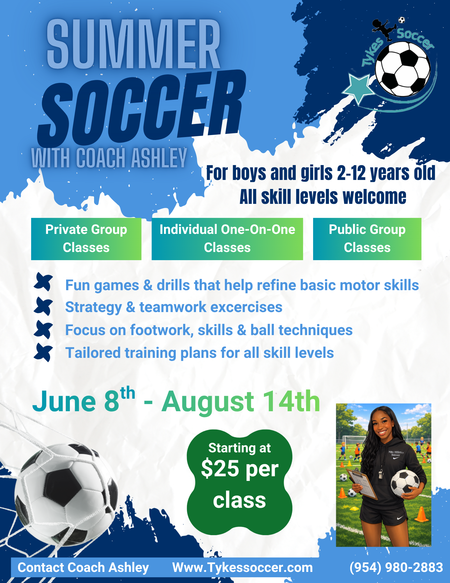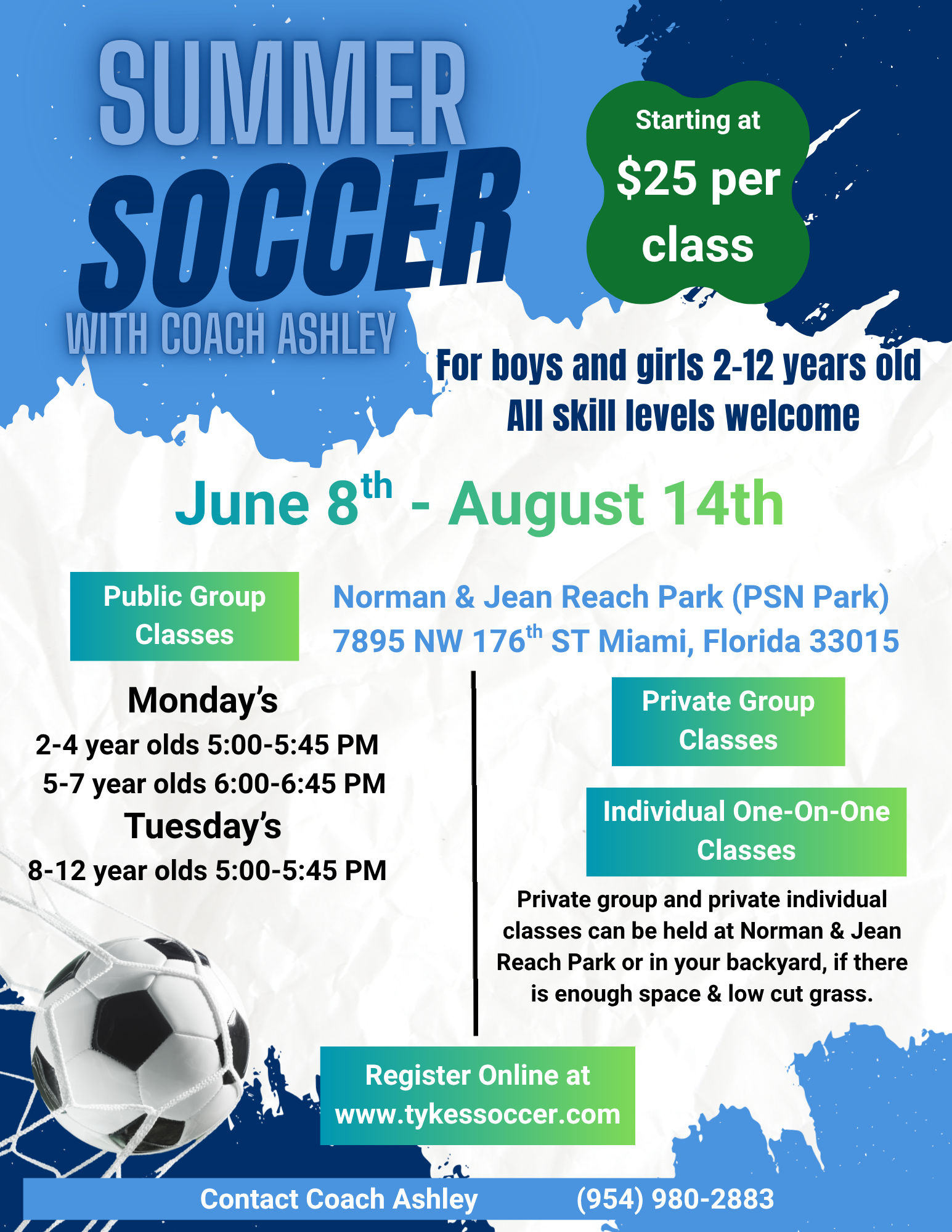 Private soccer classes are for parents organizing their own groups or wanting one-on-one sessions for their kids. Usually once a week, with options for more frequent sessions.
